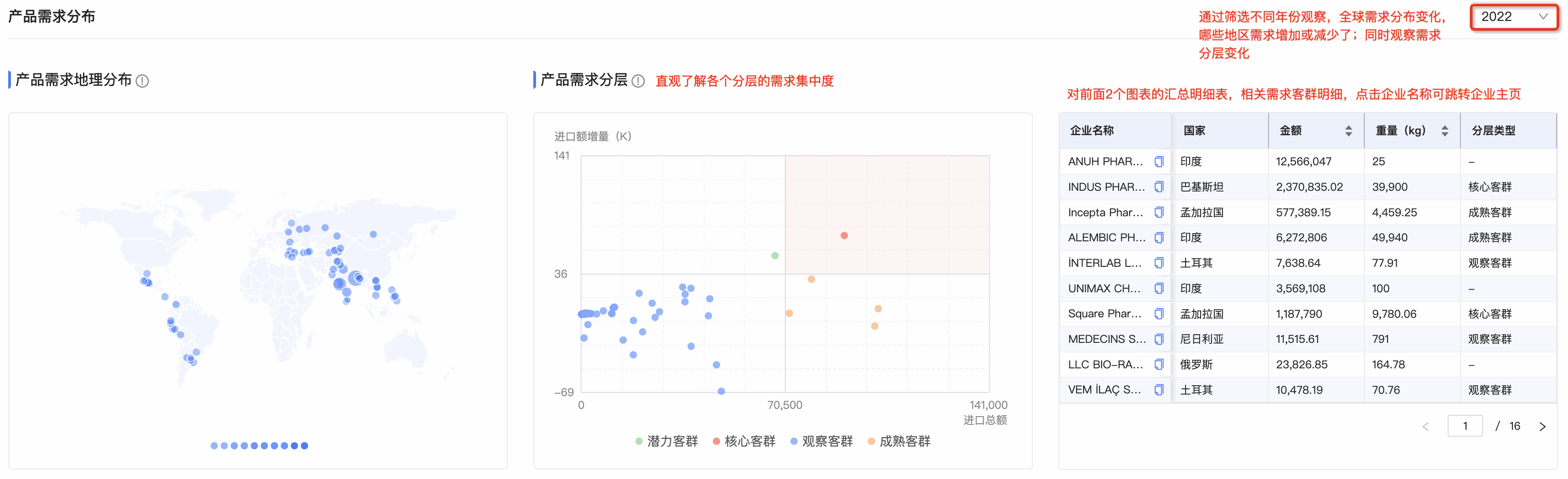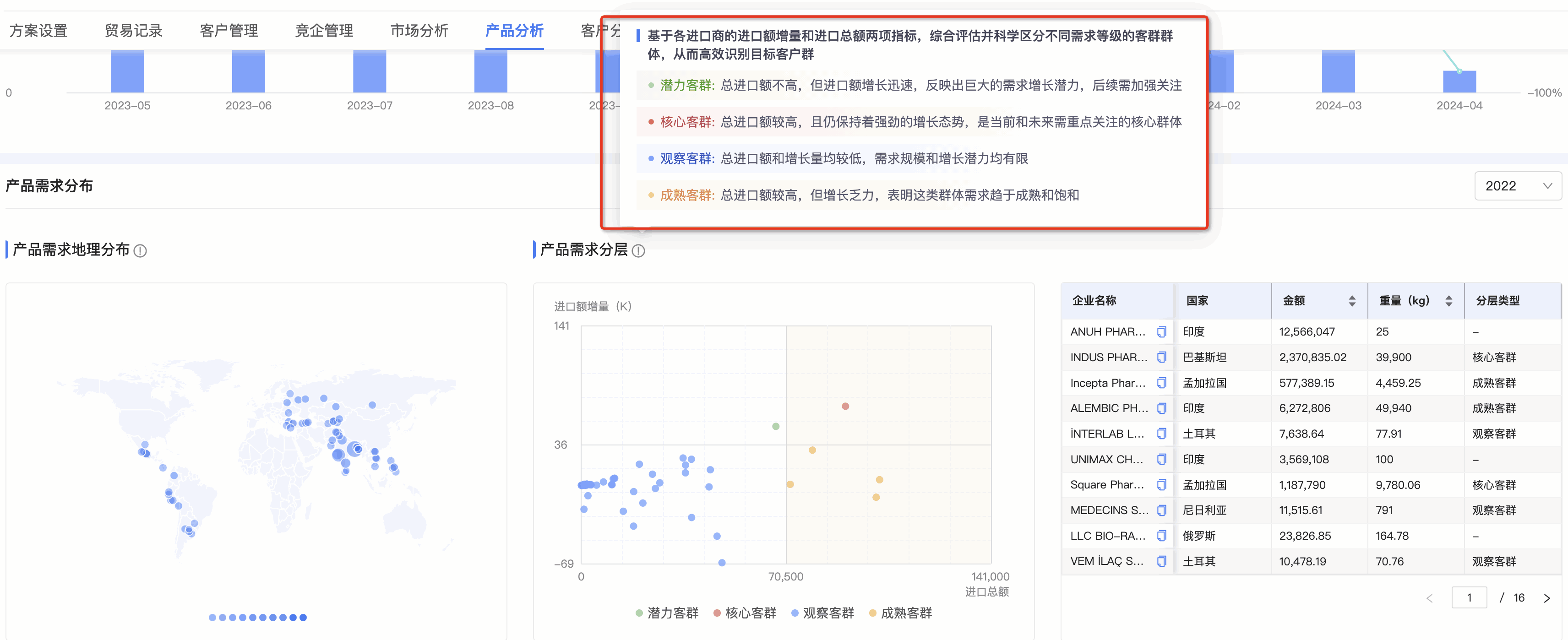 ● 产品需求分层图:九州ku游官网数据通将需求客群按照进口额增量和总额进行分层,划分为潜力、观察、成熟和核心四个层级。分层有助于用户快速锁定目标客户群体。标题旁附需求分层的解读,能让用户更直观、快速理解每个层级的特征,能够更快速的识别目标客群。