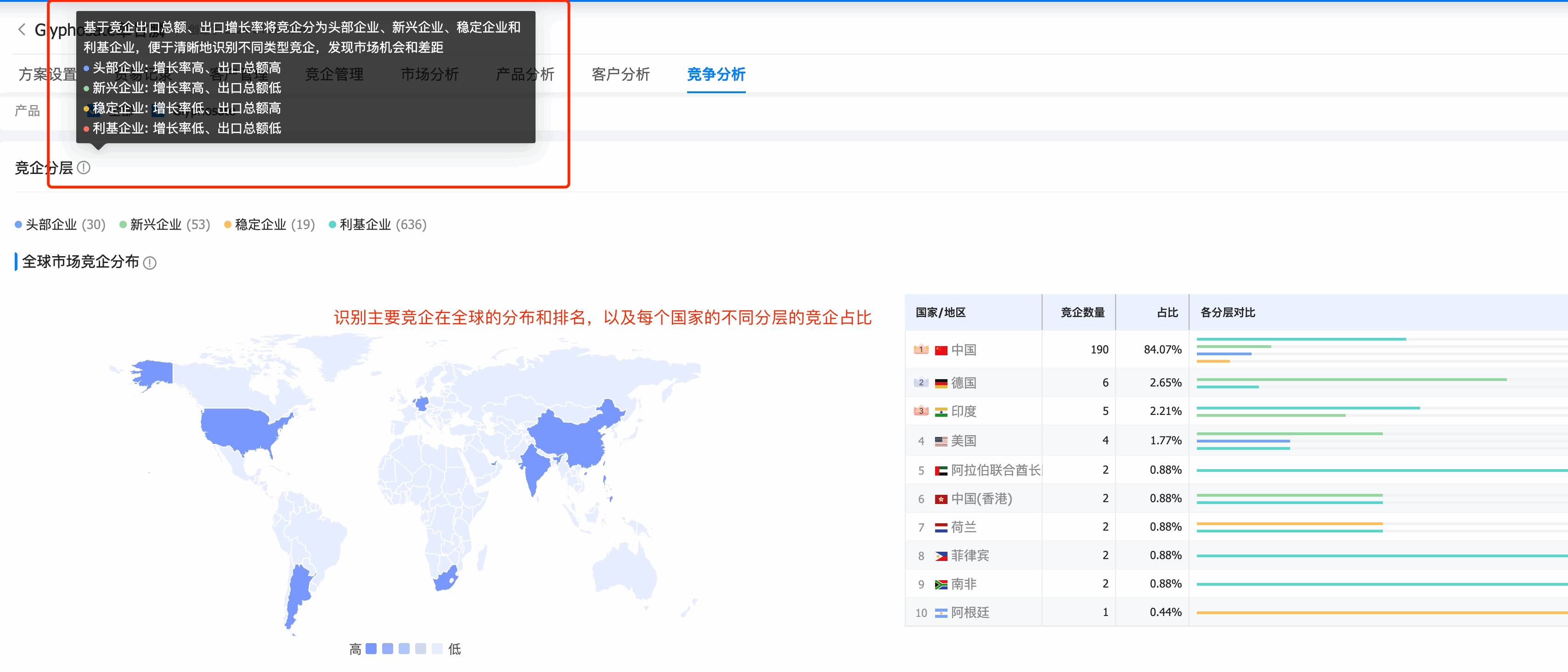 2. 九州ku游官网商情洞察市场分析模块新增「竞争分析」模块,分析目标产品全球竞争格局,其中: